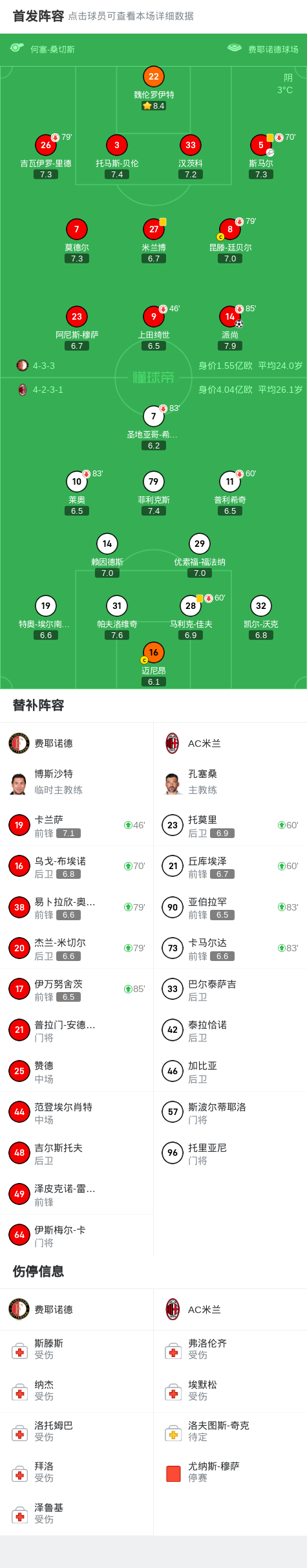 AC米兰在落后一球的情况下开始加强进攻,他们试图通过中场的控制来制造机会。然而,费耶诺德的防守表现出色,成功抵挡住了AC米兰的多次进攻。尽管AC米兰在上半场的比赛中占据了一定的控球优势,但他们未能将这种优势转化为进球,错失了扳平比分的机会。